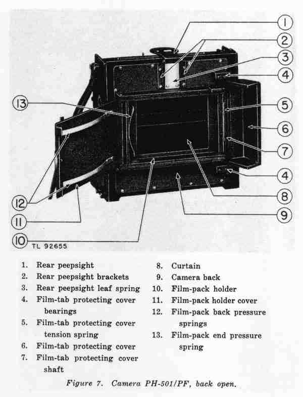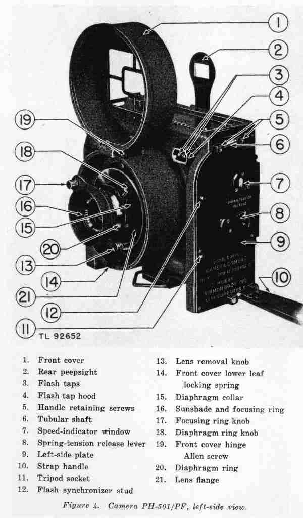 This 9-inch, f/6,3 lens (up to f/32) is used only when it is necessary to secure a close-up view of an object over 50 feet from the camera. Focusing distance 10 feet to infinity. Its field of coverage is indicated accurately when the small rectangle in the front cover is framed in the rear peepsight. |